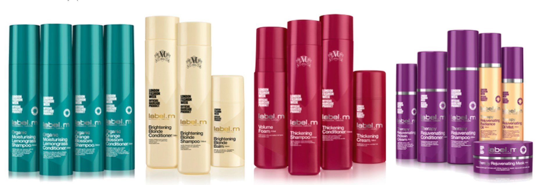 La primera colección de label.m se lanzó en 2005 e incluía 15 productos diferentes. En la actualidad, cuenta con 61 productos clasificados según el sencillo sistema 4C: Cleanse, Condition, Create y Complete. Entre la amplia oferta se encuentran las gamas Organics, Therapy Age-Defying (que combate 5 signos clave de envejecimiento del cabello) y Lab Remedy (nuestra nueva gama de tratamiento profesional exclusiva para salones).